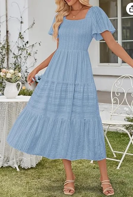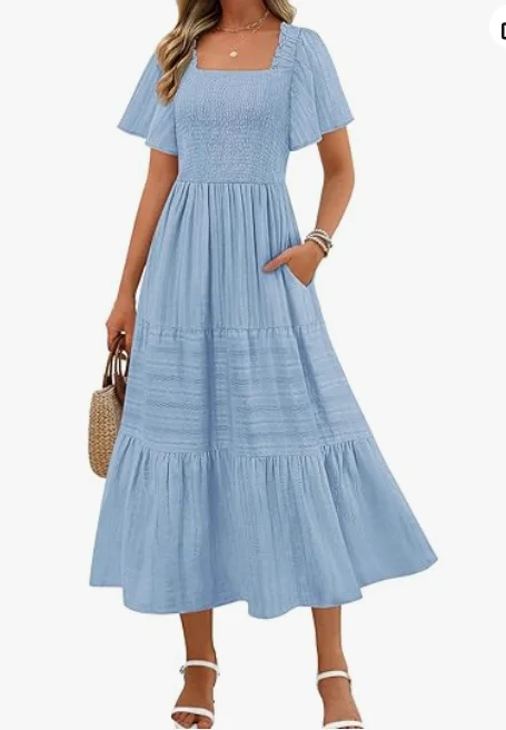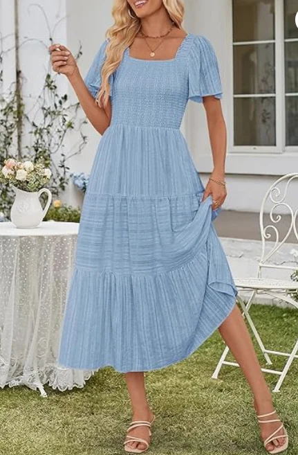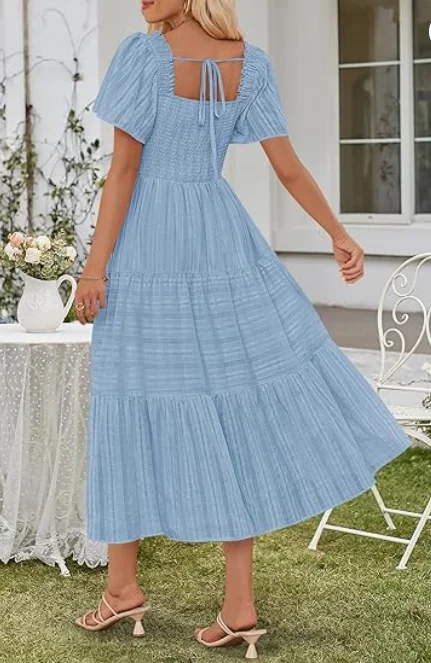 Summer Bohemian-Style Mid-Length Dress Flowing Short-Sleeved Square-Neck Pleated Layered Ruffled Design Eco-Friendly Natural